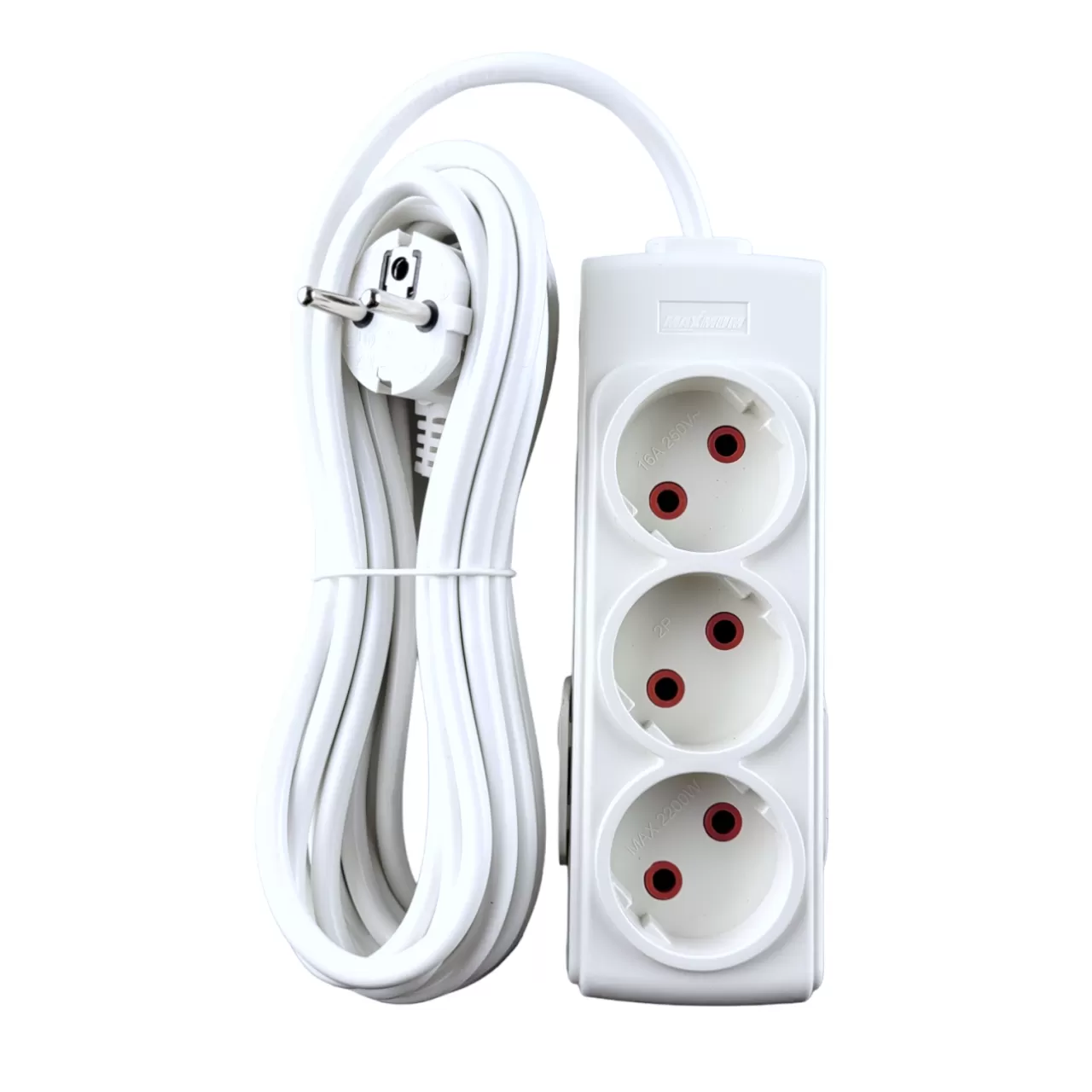 Бытовой электрический удлинитель 3 метра от "MAXIMUM QUALITY TOOLS" рассчитан на подключение к сети переменного тока от одного до трех приборов одновременно. Белый корпус из негорючего АБС-пластика оборудован тремя утопленными розетками типа «евростандарт». Удлинитель подходит для использования только внутри помещений. На тыльной стороне создано крепление для подвеса. Номинальное напряжение 220 В, номинальный ток 16 А, степень защиты от пыли и воды IP 20. Длина корпуса 165 мм.