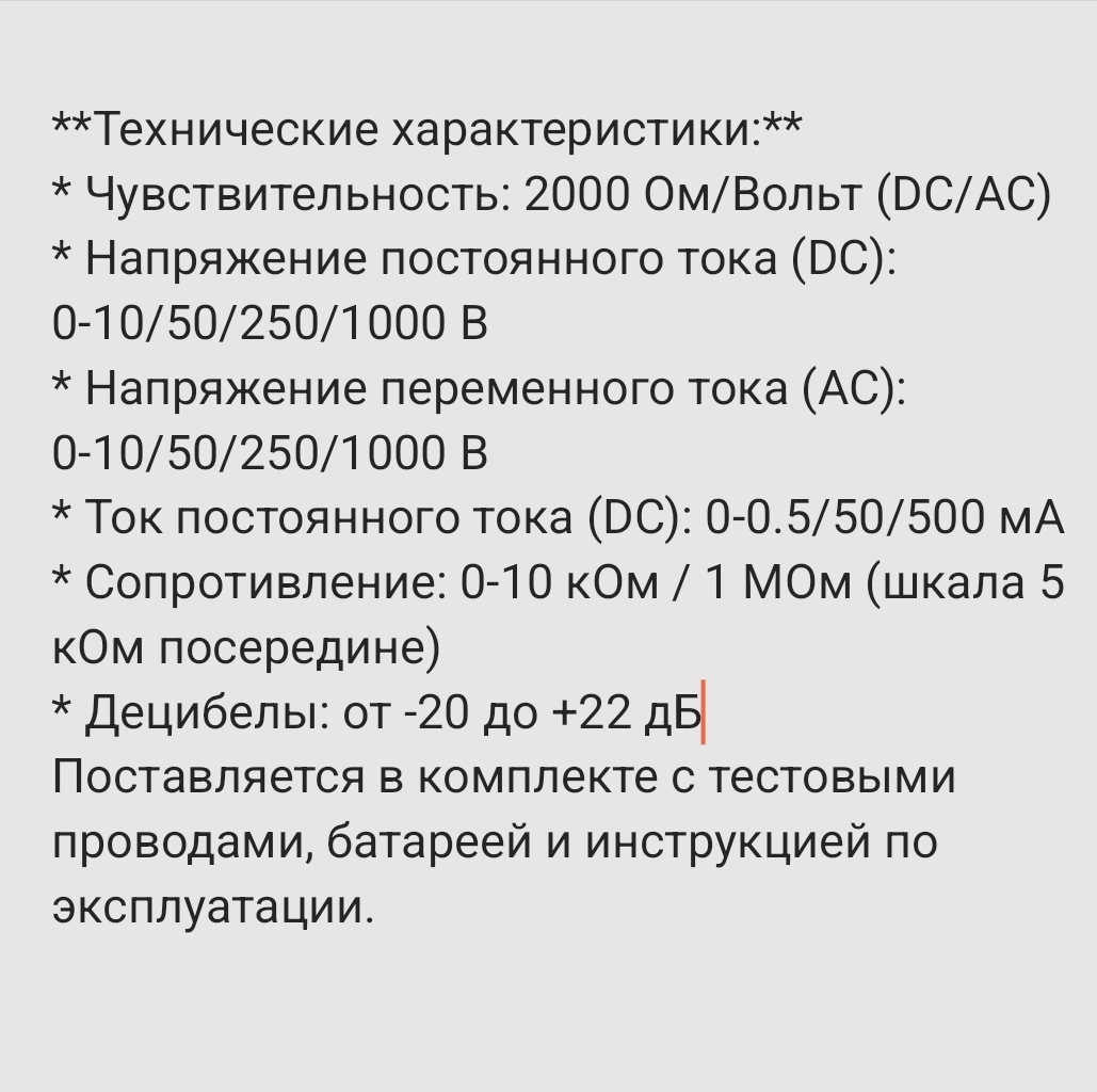 Поставляется в комплекте с тестовыми проводами 40 см., батареей и инструкцией по эксплуатации.